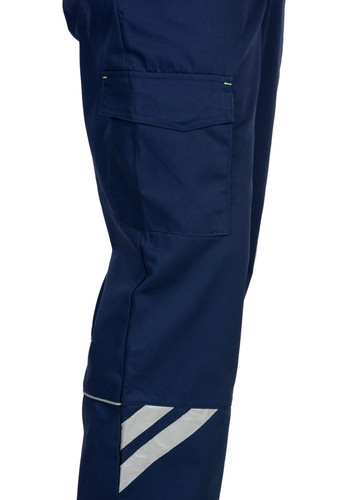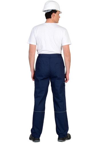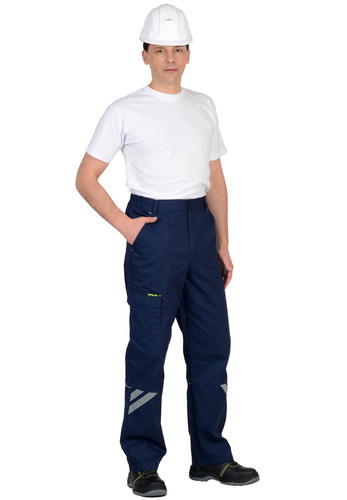 Брюки с притачным поясом с эластичной лентой по боковым швам, застегивающимся на пуговицу, со шлевками, с застежкой гульфика на молнию, с различными функциональными карманами, с элементами из СВ канта и СОП, обеспечивающие безопасность работы в условиях пониженной видимости. Ткань смесовая с МВО пропиткой.