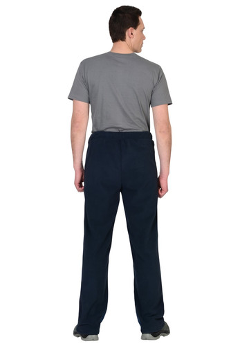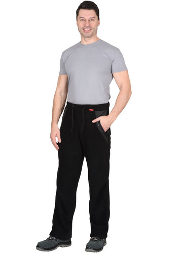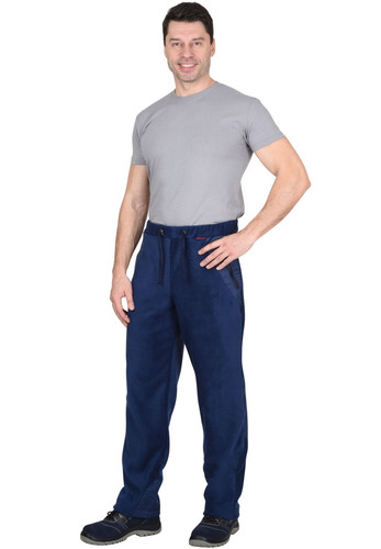 Брюки прямого покроя; с притачным поясом стянутым эластичной тесьмой и шнуром с фиксаторами, с боковыми вертикальными карманами, застегивающимися на молнию. На брюках располагаются декоративные вставки из ткани Дюспо, сверху в области бокового шва и снизу по шаговому шву.