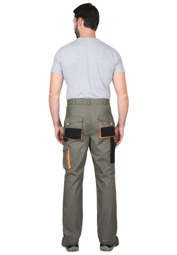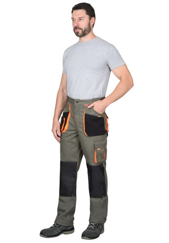 Брюки с застёжкой гульфика на молнию, с поясом на резинке, со шлевками, с накладными боковыми объемными карманами, с объемными наколенниками, с накладным объемным карманом на боковом шве с клапаном на липучке, двумя объемными карманами с клапанами на задних половинках, и карманами для инструментов.