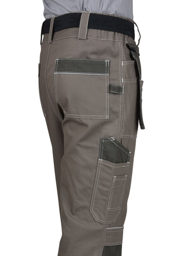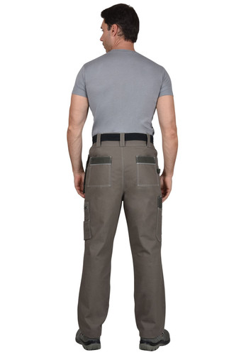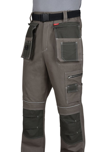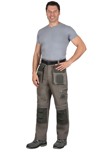 Брюки прямого силуэта, с притачным поясом, с застежкой гульфика на тесьму – «молния», с различными многофункциональными карманами, с объёмными наколенниками. В брюках предусмотрен ремень из резинки ременной «Сириус» застегивающийся на защелку-фастекс. В брюках предусмотрен кант СВ 3мм светоотражающий 100 К для обозначение видимости.