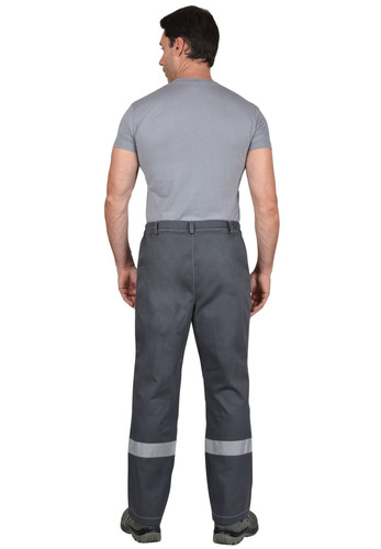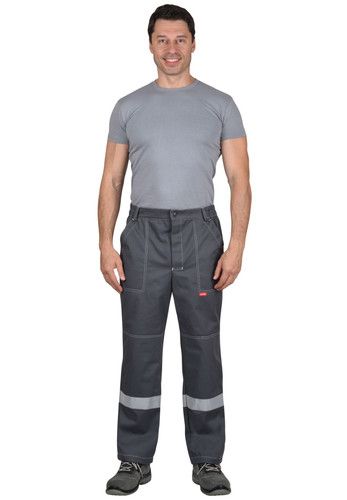 Брюки прямые, с застёжкой гульфика на пуговицы, с притачным поясом, с частичной стяжкой по бокам на резинку, с внутренними боковыми карманами и наколенниками, с двумя задними накладными карманами и карманами для инструментов. В брюках предусмотрен СОП шириной 50мм для обозначения сигнальной видимости. Ткань «Контакт 250» с МВО пропиткой.