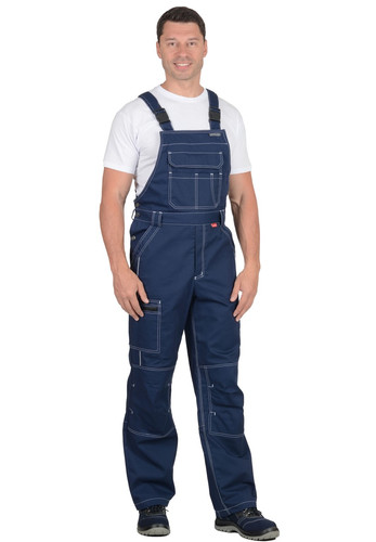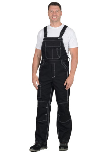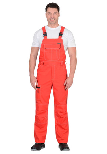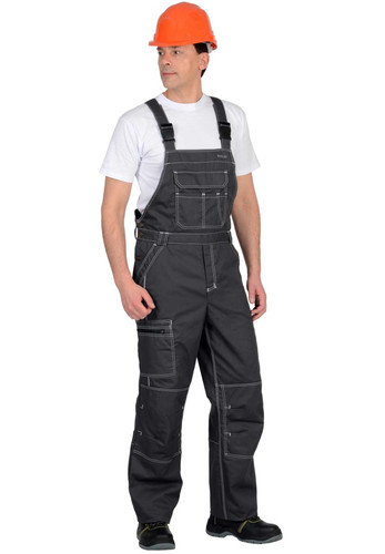 Полукомбинезон прямого силуэта, застежкой гульфика на молния, с различными многофункциональными карманами, с застежкой в правом боковом шве на пуговицы, с наколенниками, с бретелями регулируемыми эластичной тесьмой и фастексами, с эластичной тесьмой по линии талии, на передних половинках в рельеф вшивается СВ кант.
