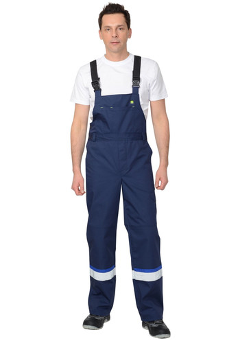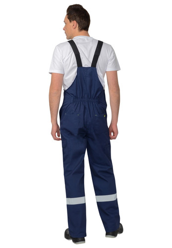 Полукомбинезон с застёжкой гульфика и застёжкой в правом боковом шве на пуговицы, верхним накладным карманом и нижними внутренними боковыми карманами, с наколенниками, с накладным карманом на левом боковом шве с клапаном на липучке, с патой, с двумя задними и карманами для инструментов, по спинке вставлена резинка.