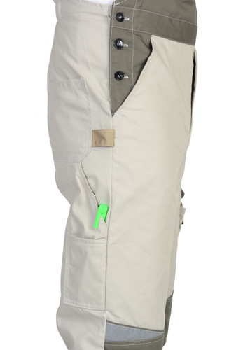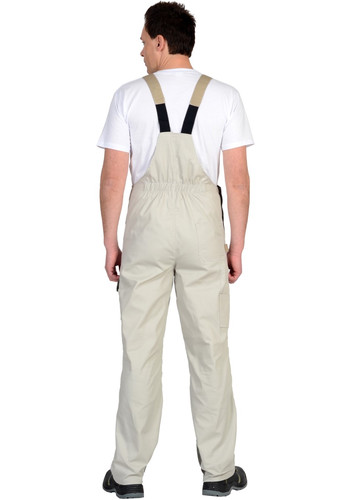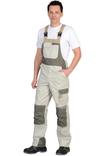 Полукомбинезон прямой с застёжкой спереди на «молнию» и с застёжкой в правом боковом шве на пуговицы, с отрезной грудкой, цельнокроенной спинкой, с бретелями. Передние половинки с объёмными наколенниками фигурной формы по верху. Задние половинки цельнокроеные, с верхним накладным карманом, с карманами для инструментов, настроченными один на другой, и шлёвкой для инструмента.