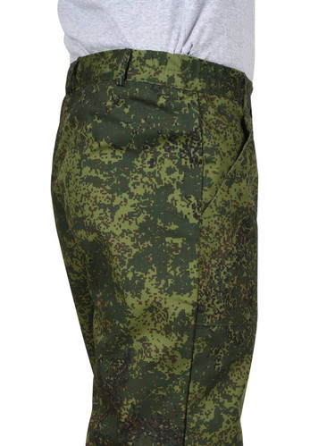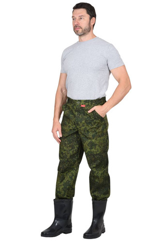 Брюки с притачным поясом, заст.гивающимся на пуговицу; с 5 шлевками и эластичной тесьмой по боковым швам брюк; с застежкой гульфика на три петли и пуговицы; с двумя накладными боковыми карманами с наклонным входом.