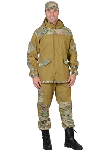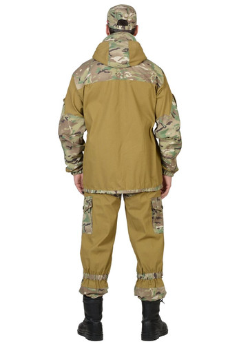 Куртка удлиненная, прямого силуэта, с центральной супатной застежкой на 4 петли и пуговицы, нижняя петля сквозная, с карманами листочка и фигурным клапанами на пуговицу, с внутренним карманом на пуговицу. Рукава с полу объемными накладными карманами и фигурными клапанами застегиваются на потайную липучку, с притачной нижней деталью на резинке, с налокотниками. Капюшон с козырьком, двумя кулисами для регулировки, застежкой на 2 петли и пуговицы. В области талии резинка для частичной стяжки. Низ куртки регулирует шляпной резинкой.