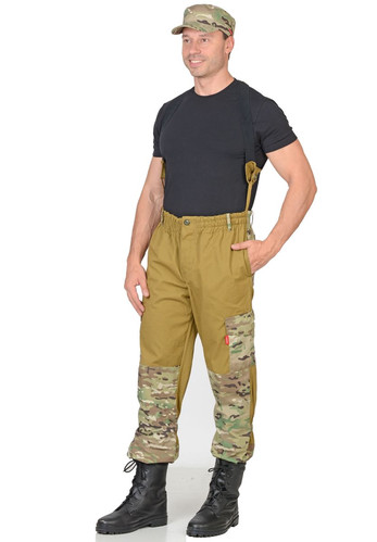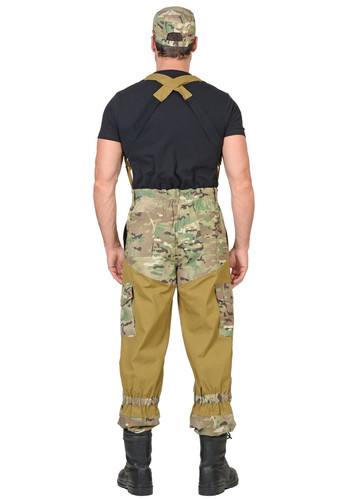 Брюки с центральной застежкой гульфика на три петли и пуговицы, пояс цельнокроеный с застежкой на одну петлю и пуговицу, с пятью узкими шлевками, с эластичной тесьмой по всей ширине цельнокроеного пояса, со съёмными бретелями, с карманами в боковых швах, с задними накладными карманами застегивающиеся на пуговицу, с накладными карманами с объёмом на боковых швах с фигурными клапанами застегивающиеся на пуговицу, наколенниками. Понизу брюк пуфта с завязками.