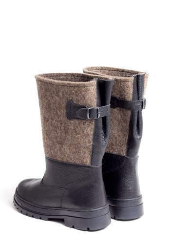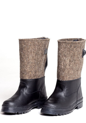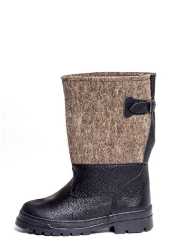 Сапоги изготовлены из натурального войлока толщиной 4-6 мм. По щиколотку покрыты натуральной кожей (юфть) толщиной 1,6 мм. Вкладная стелька из войлока. Подошва из термоэластопласта не скользит.