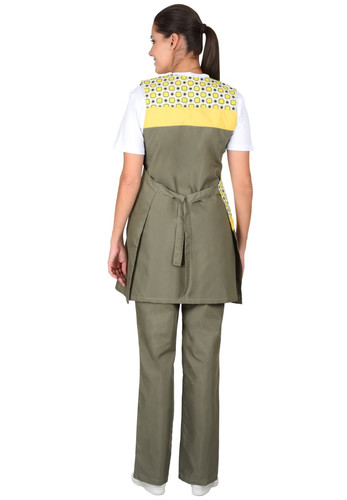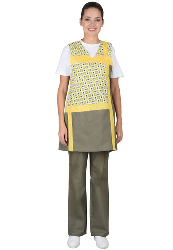 Комплект женский комбинированный , трехцветный, состоит из фартука-сарафана и брюк. Фартук-сарафан с V-образным вырезом горловины и прямой линией низа, с боковыми завязками на полочке и резинкой и пуговицей на спинке для регулировки объема по талии, с накладным карманом на правой половинке полочки. Брюки прямые, без застежки, с притачным поясом, частично стянутым резинкой и с накладными боковыми карманами.