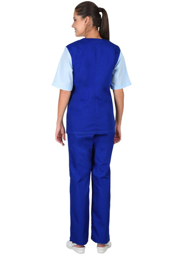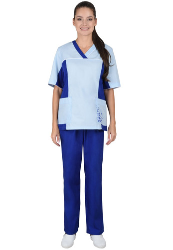 Костюм состоит из блузы и брюк. Блуза полуприлегающего силуэта, с V- образным вырезом горловины, с нижними накладными карманами. Рукава короткие. Блуза с отделочными деталями и кантами. Брюки прямые, с притачным поясом, стянутым эластичной лентой.