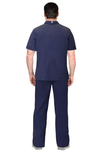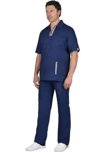 Костюм состоит из куртки и брюк. Куртка прямого силуэта с боковыми разрезами, с застежкой на тесьму - "молния" в области кокетки. Отложенный воротник. Нагрудный левый и два нижних накладных кармана. Рукава втачные, короткие.