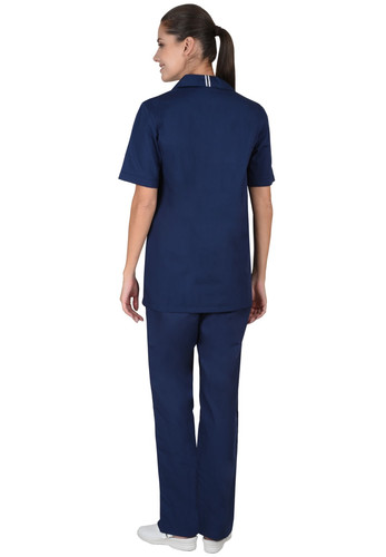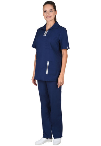 Костюм состоит из блузы и брюк. Блуза прямого силуэта с застежкой на тесьму "молния" в области кокетки. Отложной воротник. Нагрудный левый и два нижних накладных кармана. Рукава втачные, короткие. По низу блузы разрезы в боковых швах.