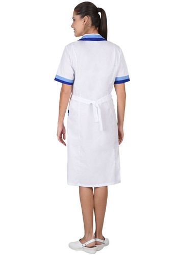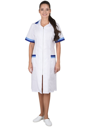 Халат с двумя нижними накладными карманами, отложным воротником и короткими рукавами. Ширина по линии талии регулируется хлястиком. Воротник, рукава и карманы с яркими отделочными элементами.