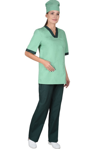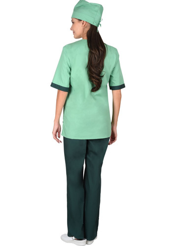 Костюм состоит из блузы, брюк и колпака. Блуза прямого покроя с V-образным вырезом горловины. На полочке один верхний и два нижних накладных кармана. Рукава короткие. Вырез горловины и манжеты рукавов из контрастной ткани. Брюки прямого покроя на резинке. Колпак одноцветный с отворотом.