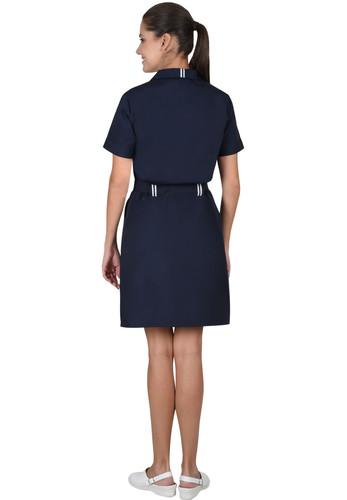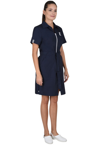 Халат женский полуприлегающего силуэта с центральной застежкой на молнию. Отложной воротник. Нагрудный накладной карман на левой полочке и два нижних накладных фигурных кармана. Рукава втачные короткие. Халат с завязывающимся поясом.