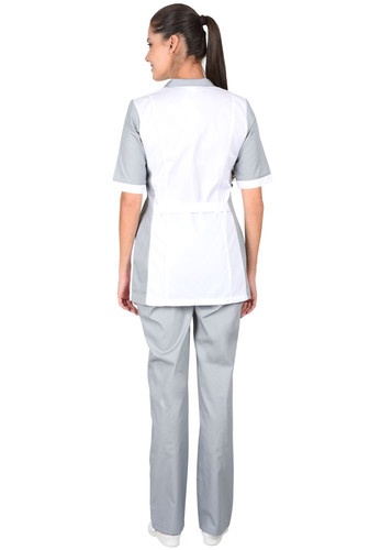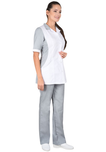 Костюм состоит из блузы и брюк. Блуза полуприлегающего силуэта, с центральной застёжкой на рубашечные кнопки. Воротник отложной с лацканами. На полочке расположены верхний накладной и нижние внутренние фигурные карманы. Рукава втачные, укороченные с манжетами. Детали блузы выполнены из отделочной ткани в цвет брюк. Брюки прямого силуэта, с застёжкой гульфика на тесьму «молния». Пояс притачной, застёгивающийся на петлю и пуговицу. Ширина пояса регулируется эластичной тесьмой в области боковых швов.
