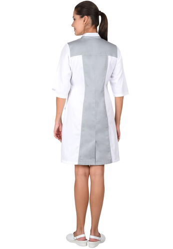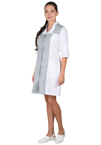 Халат женский, полуприлегающего силуэта с центральной застёжкой на пуговицы, с верхним и нижними фигурными карманами. Воротник «стойка». Рукава втачные, укороченные. Детали халата выполнены из отделочной ткани. По спинке шлица.