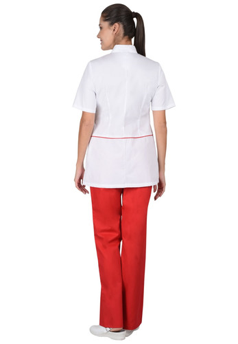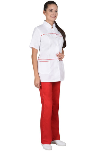 Костюм состоит зи блузы и брюк. Блуза полуприлегающего силуэта, с центральной застёжкой на 6 петель и пуговиц, с воротником «стойка», Полочка с одним верхним и двумя нижними накладными карманами. Рукава втачные, короткие. Блуза отделана втачным кантом из контрастной ткани в цвет брюк. Брюки прямого силуэта, с заниженной талией, с застежкой гульфика на тесьму "молния", притачным поясом, застегивающимся на пуговицу, частично стянутым резинкой по боковым сторонам.