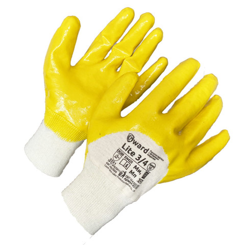 Трикотажные перчатки на плотной основе интерлок, покрытые жёлтым нитрилом премиум-качества на три четверти - закрыты пальцы, ладонь и тыльная сторона ладони по костяшки.