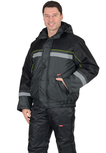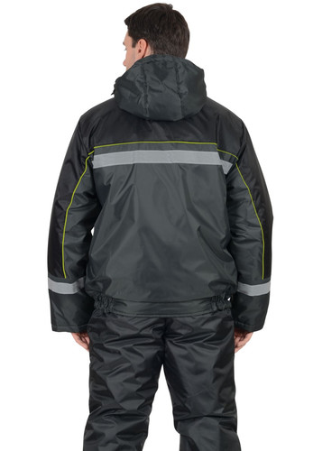 Куртка укороченная; прямого силуэта; с притачной утеплённой подкладкой, с притачным утеплённым капюшоном; с центральной застёжкой на двухзамковую тесьму - «молнию»; с внутренней малой ветрозащитной планкой правой полочки; внешней ветрозащитной планкой левой полочки ; с притачным поясом с эластичной лентой по боковым сторонам. Рукава с внутренними трикотажными напульсниками.По полочкам, спинке и рукавам куртки настрочена лента светоотражающая СОП шириной 50мм, для обозначения сигнальной видимости.
