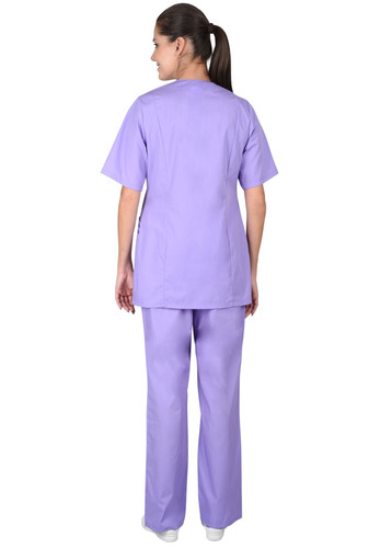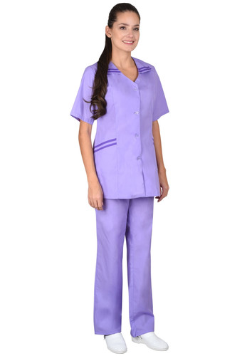 Костюм состоит из блузы и брюк. Блуза приталенного силуэта с застёжкой на пуговицы, короткими рукавами, с отделкой по воротнику и нижним карманам. Брюки прямого покроя без карманов с притачным поясом стянутым резинкой.