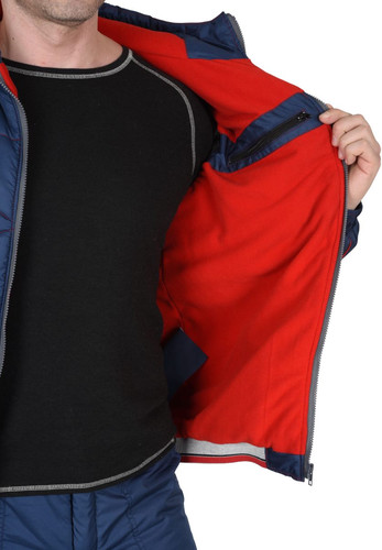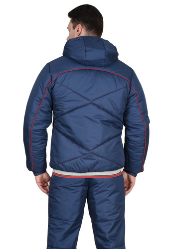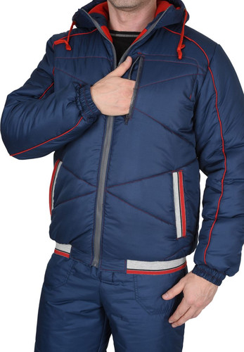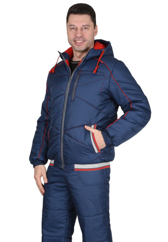 Куртка утепленная с центральной застежкой на тесьму - «молния», с карманами в листочку с втачными концами из декоративной резинки, с верхним прорезным карманом в рамку застегивающийся на тесьму - «молния», с втачным капюшоном, с притачным поясом из декоративной резинки. Рукава втачные с притачными манжетами, манжет с частичной стяжкой на резинку ткацкую. В куртке вшивается кант 3мм для обозначения видимости.
