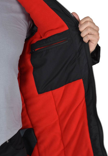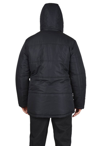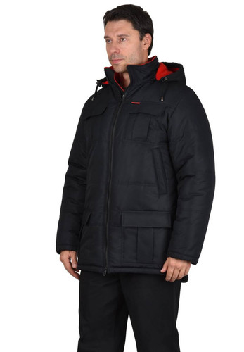 Куртка мужская, длинная, стеганая; с притачной утеплённой подкладкой; с фигурной линией низа спинки; с центральной застёжкой на двухзамковую тесьму - «молния» до верха; с внутренней подпланкой простёганной 5-ю отделочными строчками; с воротником-стойка; с утепленным пристегивающимся капюшоном на тесьму - «молния». Рукава втачные, двухшовные.