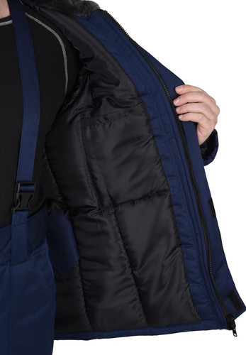 Куртка прямая, с притачной утепленной подкладкой, с ветрозащитной прокладкой из ткани «Лаке», с центральной застежкой на двухзамковую тесьму - «молния», с внешней ветрозащитной планкой застегивающиеся на потайные текстильные застежки «липучка» , с отложным воротником с мехом, с утепленным пристегивающимся капюшоном , с нижними накладными карманами.