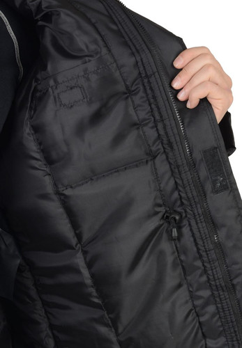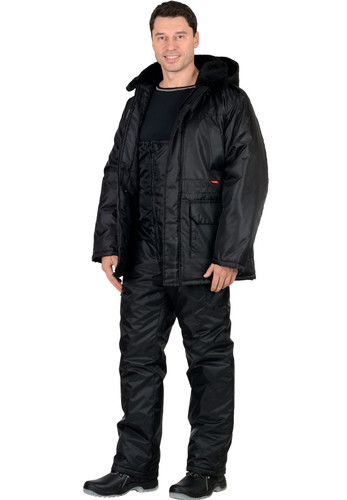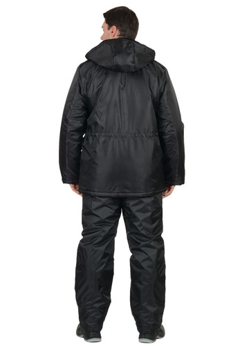 Костюм мужской утеплённый: куртка длинная, полукомбинезон.Костюм состоит из куртки и полукомбинезона.Куртка длинная прямого силуэта с притачной утеплённой подкладкой, с центральной застёжкой на тесьму-"молнию" и внешним ветрозащитным клапаном с 3-мя текстильными застёжками-"липучками" (длиной 6,5см), верхними и нижними карманами, отложным воротником, пристёгивающимся капюшоном.