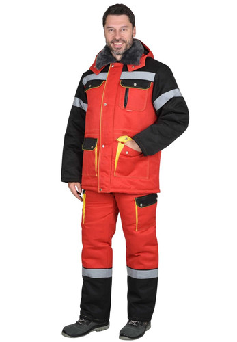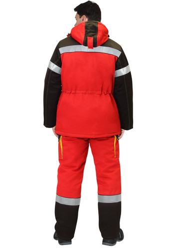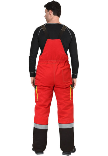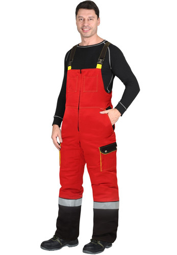 Полукомбинезон - прямой, с притачной утеплённой подкладкой, с регулируемыми по длине, при помощи пряжек – фастексов, бретелями; с притачным нагрудником; с центральной застёжкой на двухзамковую тесьму - «молния»; с нагрудными накладными карманами, с двумя боковыми внутренними карманами, с двумя накладными карманами на боковых швах, с фигурным клапаном, застёгивающимся на 2 кнопки на каждом клапане.