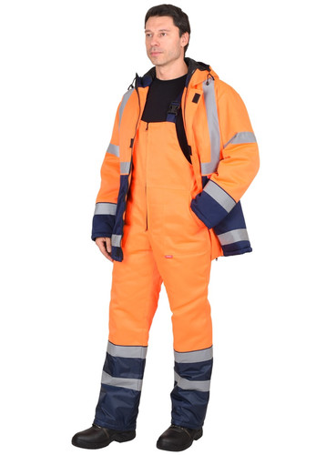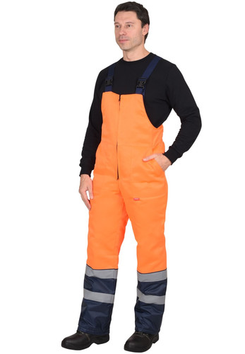 Полукомбинезон прямой, с отрезной грудкой и спинкой, с центральной застёжкой на двухзамковую тесьму - «молния», с накладными боковыми карманами, с эластичной лентой по спинке, для лучшего прилегания. Бретели регулируются при помощи эластичной ленты и пряжек фастексов. Используется СОП 50 мм для обозначения сигнальной видимости.