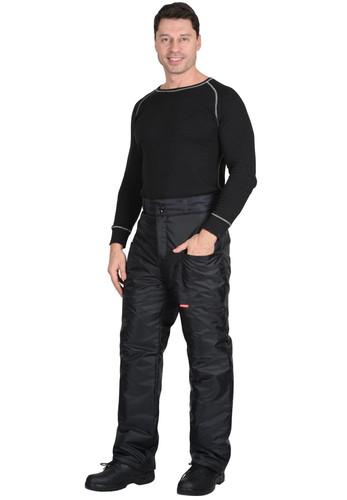 Брюки прямые с широким поясом, с застежкой на две обметанные петли и пуговицы, пятью шлёвками: две на передней, и три на задней части пояса, с центральной застежкой гульфика на тесьму - «молния» и ветрозащитным клапаном, двумя накладными карманами.