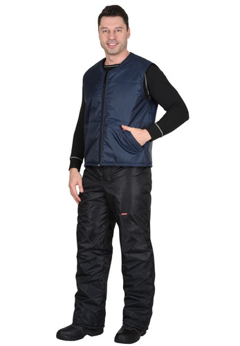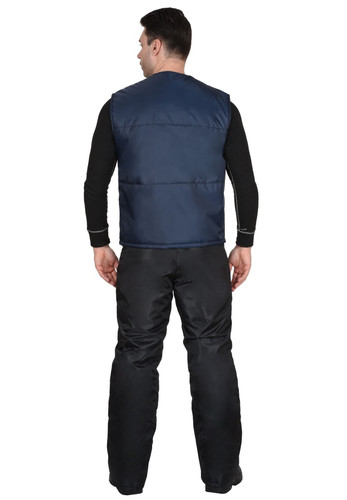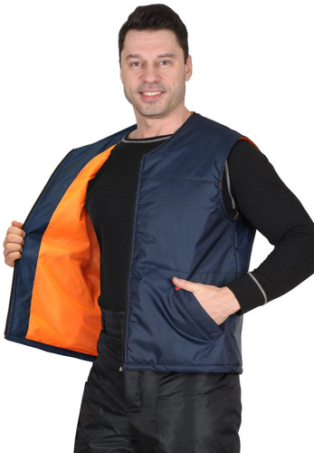 Жилет с горизонтальными строчками стежки полочек и спинки. V-образным вырезом горловины, с центральной застежкой-молнией, наклонными боковыми прорезными карманами с "листочкой".