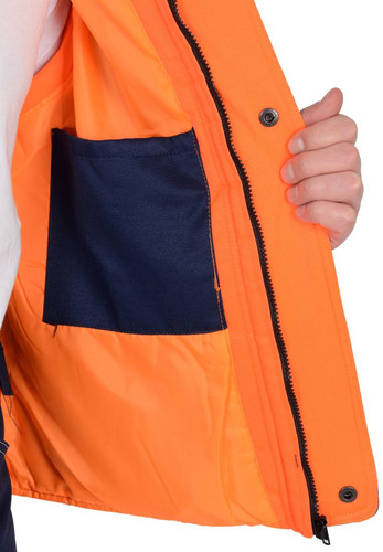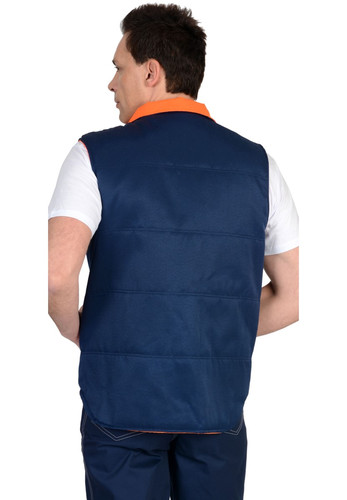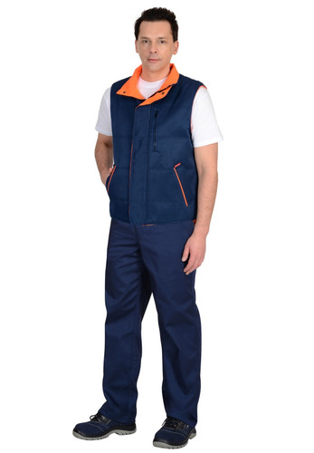 Жилет прямого силуэта утепленный с застежкой на молнию, с планкой. Воротник – стойка. Полочки с двумя нижними прорезными карманами. Внутренний накладной карман. Спинка удлинена.
