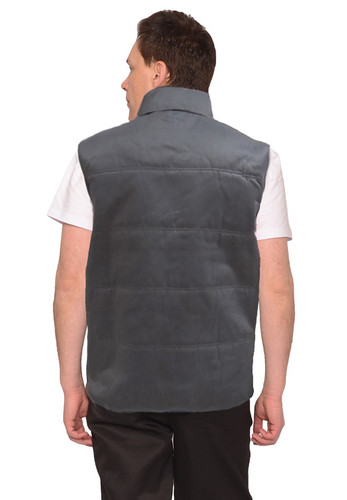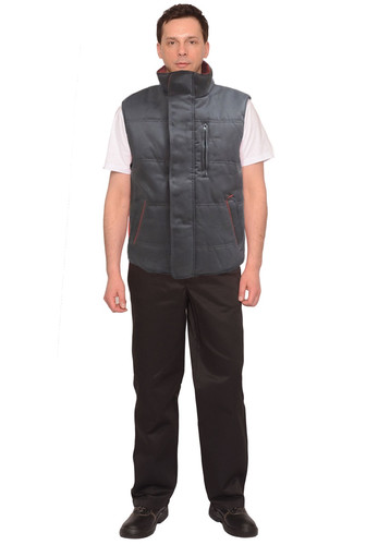 Жилет прямого силуэта утепленный с застежкой на молнию, с планкой. Воротник – стойка. Полочки с двумя нижними прорезными карманами. Внутренний накладной карман. Спинка удлинена.