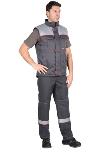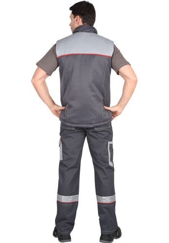 Жилет утепленный, с центральной застёжкой на тесьму-«молнию», с ветрозащитной планкой, застегивающейся на потайные липучки, с верхними накладными карманами с клапанами, застегивающимися на потайную липучку длиной, с нижними карманами в рельефном шве, с внутренним карманом на молнии, с воротником-стойка, с фигурной линией низа по спинке.