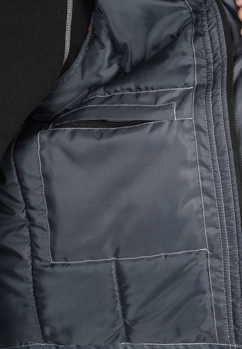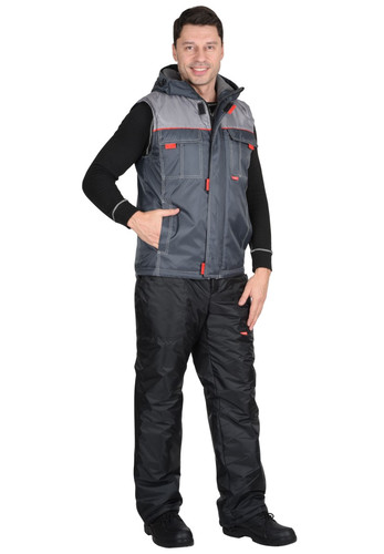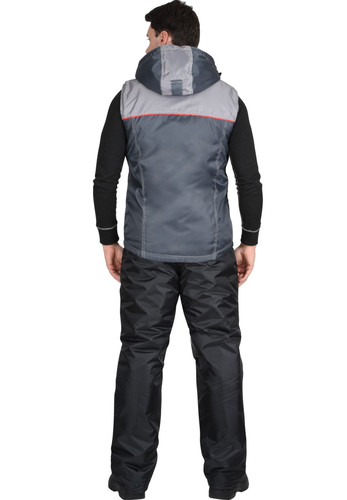 Жилет утепленный, с центральной бортовой застёжкой на тесьму-«молнию», с ветрозащитной планкой, застегивающийся на потайные липучки 3шт., с верхними накладными карманами и клапанами застегивающиеся на потайную липучку длиной 4,0см, с нижними карманами в рельефном шве, с внутренним карманом на тесьму-«молния», с втачным капюшоном, с фигурной линией низа по спинке.