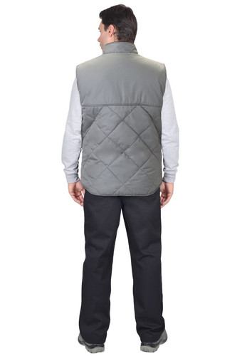 Жилет утеплённый, стёганный, прямого силуэта, на подкладке из флиса с центральной бортовой застёжкой на молнию, с воротником стойка, с нагрудным карманом с молнией и нижними фигурными утеплёнными карманами. Жилет с удлинённой спинкой.