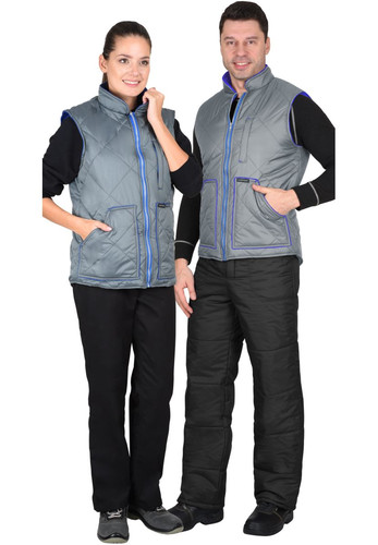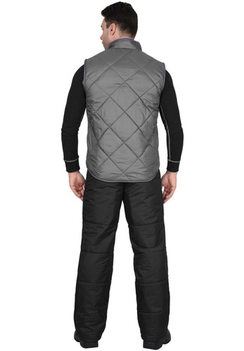 Жилет утеплённый, стёганный, прямого силуэта, на подкладке из флиса с центральной бортовой застёжкой на молнию, с воротником стойка, с нагрудным карманом с молнией и нижними фигурными утеплёнными карманами. Жилет с удлинённой спинкой.