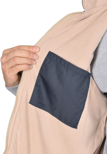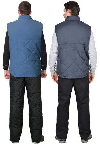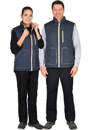 Жилет утеплённый, стёганный, прямого силуэта, на подкладке из флиса с центральной бортовой застёжкой на молнию, с воротником стойка, с нагрудным карманом с молнией и нижними фигурными утеплёнными карманами. Жилет с удлинённой спинкой.