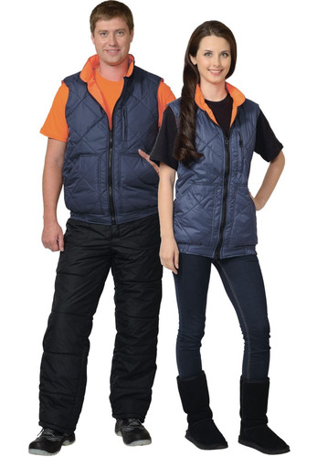 Жилет утеплённый, стёганный с центральной бортовой застёжкой на молнию, с воротником стойка, с нагрудным карманом с молнией и нижними фигурными утеплёнными карманами. Жилет на притачном поясе стянутом резинкой.