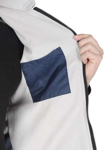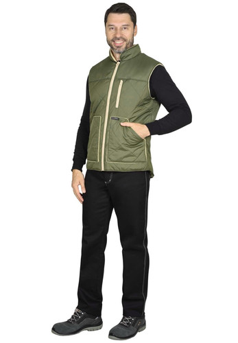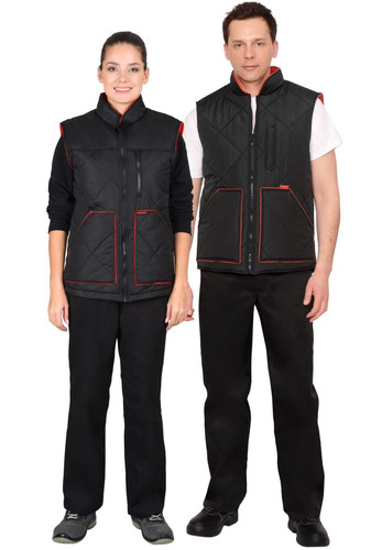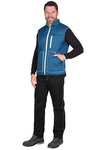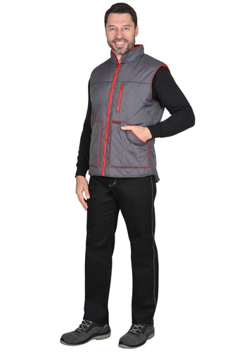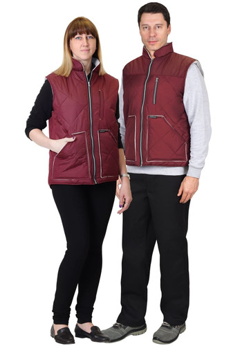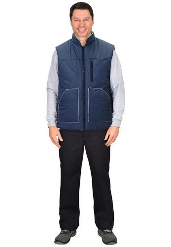 Жилет утеплённый, стёганный, прямого силуэта, на подкладке из флиса с центральной бортовой застёжкой на молнию, с воротником стойка, с нагрудным карманом с молнией и нижними фигурными утеплёнными карманами. Жилет с удлинённой спинкой.