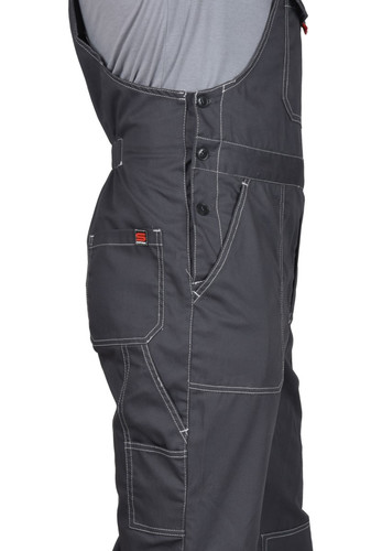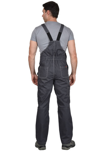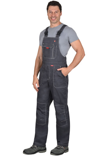Полукомбинезон с застежкой спереди на однозамковую тесьму молния и в правом боковом шве на три обметанные петли и пуговицы; с различными многофункциональными карманами, объемными наколенниками; с регулируемыми за счет эластичной ленты и фастексов бретелями; с эластичной лентой по спинке, для лучшего прилегания.