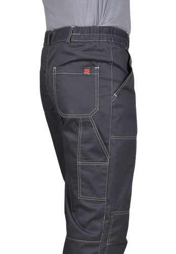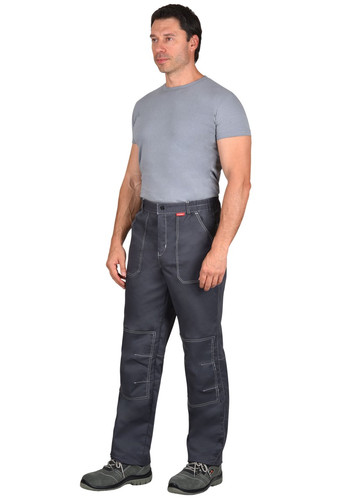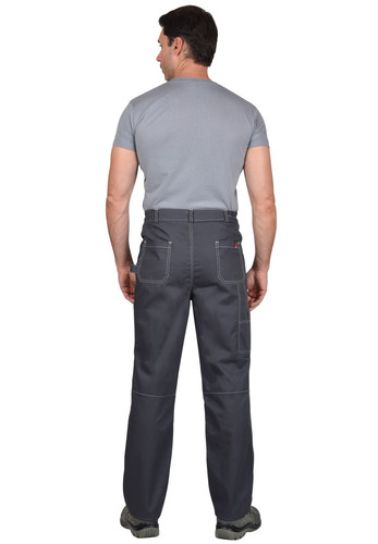 Брюки с застежкой спереди на однозамковую тесьму молния и на одну обметанную петлю и пуговицу на поясе; с различными многофункциональными карманами; обьемными наколенниками; с притачным поясом, частично стянутым резинкой по бокам.