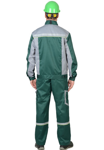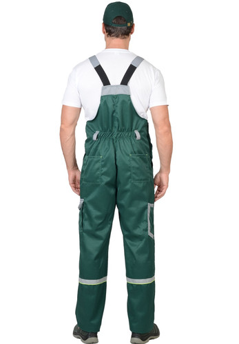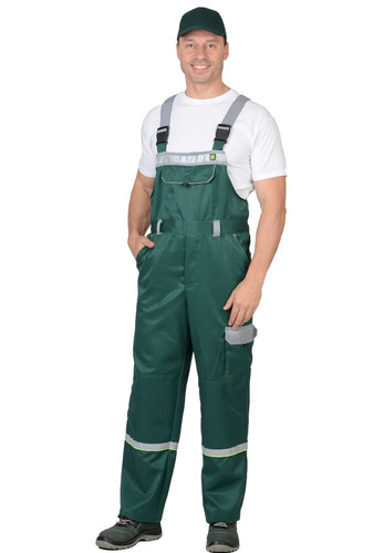 Полукомбинезон с застёжкой гульфика и застёжкой в правом боковом шве на три петли и пуговицы, верхним накладным карманом и нижними внутренними боковыми карманами, с наколенниками, с накладным карманом на левом боковом шве с клапаном на кнопке с патой, с двумя задними и карманами для инструментов, по спинке вставлена резинка.