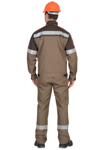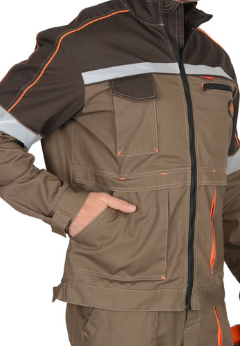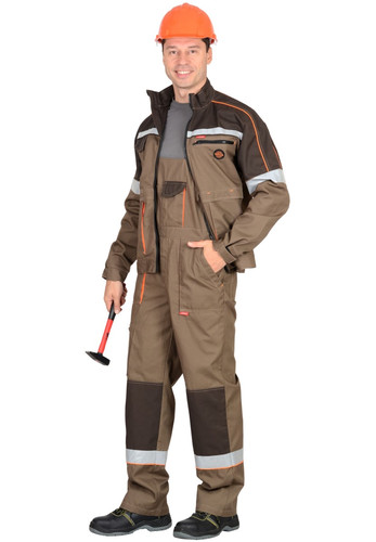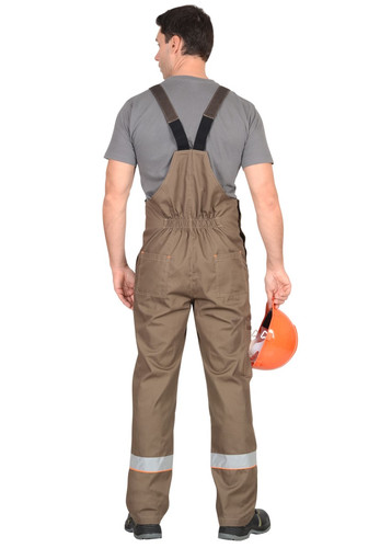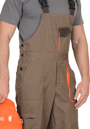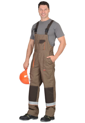 Полукомбинезон прямой с застежкой гульфика на молнию, с боковой застежкой на пуговицах, с нагрудными карманами, с боковыми накладными карманами, с двумя задними карманами , с карманом на боковом шве на молнии, с наколенниками. Костюм со светоотражающими элементами, с контрастным кантом.