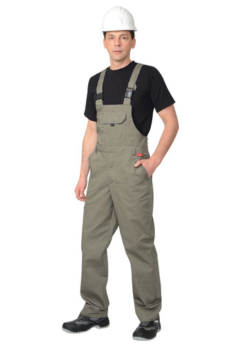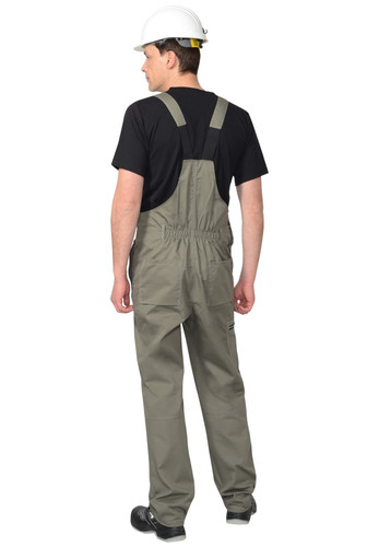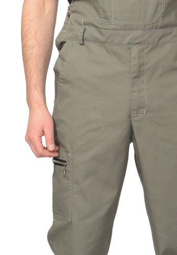 Полукомбинезон с застежкой гульфика на тесьму - «молния», с боковой застежкой на 3 петли и пуговицы. Передние половинки с внутренними боковыми карманами с «планками» с наклонным входом. На нагруднике выполнен фигурный накладной карман, с клапаном застегивающийся на «липучку». Задние половинки полукомбинезона с цельнокроеной спинкой с резинкой по спинке для лучшего прилегания, с двумя накладными карманами с нижним объемом. На правом боковом шве полукомбинезона настрочен карман, с горизонтальным входом в карман, застёгивающийся на металлическую тесьму «молнию».