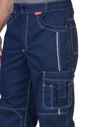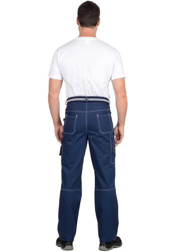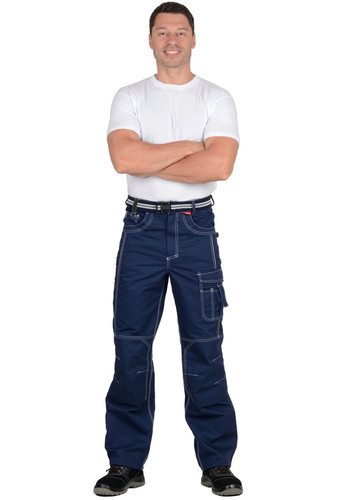Брюки прямые, на притачном поясе, с застёжкой спереди на тесьму "молния", с боковыми внутренними карманами, с часовым карманом; на задних половинках с отрезной кокеткой, двумя накладными карманами и карманами под инструменты.