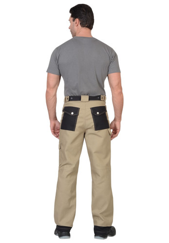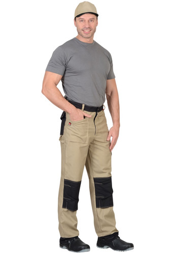 Брюки с притачным поясом, застегивающимся на джинсовую пуговицу и с регулировкой ширины пояса при помощи пат и кнопок, с накладными карманами и объемными наколенниками с возможностью вставить в них объемные щитки.