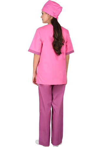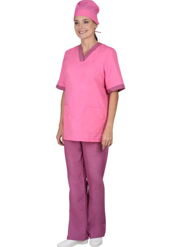Костюм состоит из блузы, брюк и колпака. Блуза прямого покроя с V-образным вырезом горловины. На полочке один верхний и два нижних накладных кармана. Рукава короткие. Вырез горловины и манжеты рукавов из контрастной ткани. Брюки прямого покроя на резинке. Колпак одноцветный с отворотом.